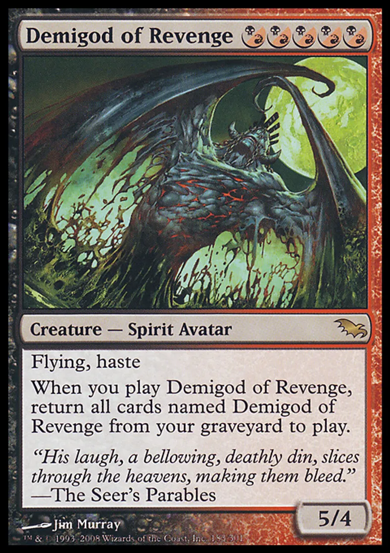 | Oracle Text | Flying, haste When you cast Demigod of Revenge, return all cards named Demigod of Revenge from your graveyard to the battlefield. | ||