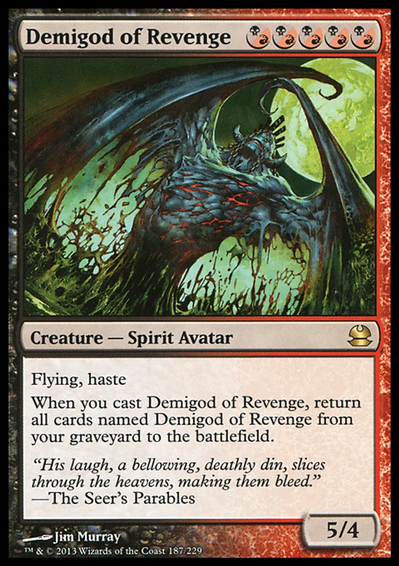| Oracle Text | Flying, haste When you cast Demigod of Revenge, return all cards named Demigod of Revenge from your graveyard to the battlefield. | ||