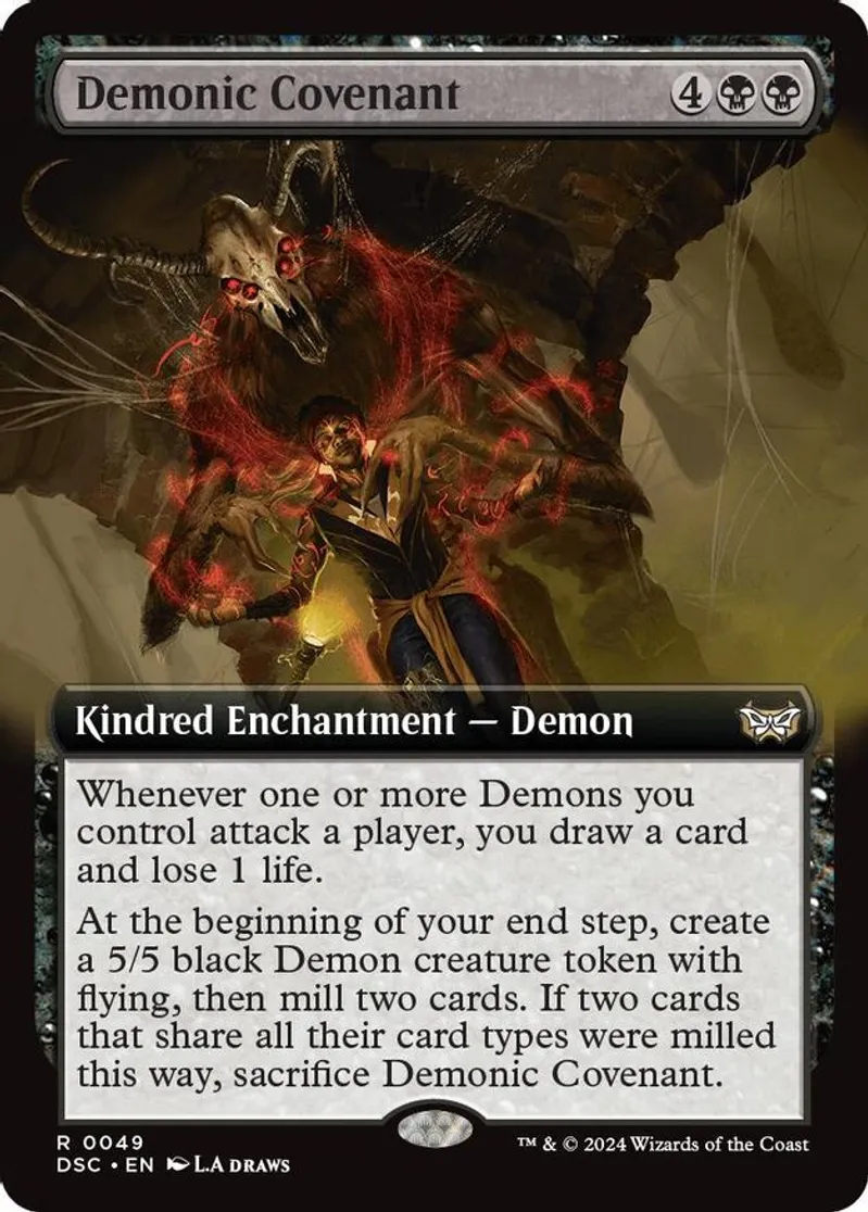 at the beginning of your end step, create a 5/5 black demon creature token with flying, then mill two cards. if two cards that share all their card types were milled this way, sacrifice demonic covenant. | ||