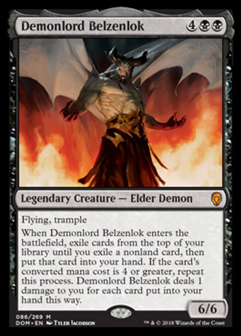 | Oracle Text | Flying, trample When Demonlord Belzenlok enters the battlefield, exile cards from the top of your library until you exile a nonland card, then put that card into your hand. If the card's converted mana cost is 4 or greater, repeat this process. Demonlord Belzenlok deals 1 damage to you for each card put into your hand this way. | ||