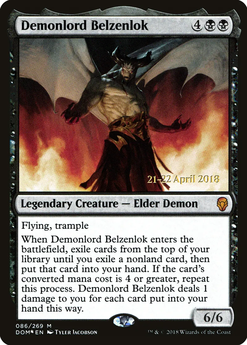 When Demonlord Belzenlok enters the battlefield, exile cards from the top of your library until you exile a nonland card, then put that card into your hand. If the card's converted mana cost is 4 or greater, repeat this process. Demonlord Belzenlok deals 1 damage to you for each card put into your hand this way. | ||