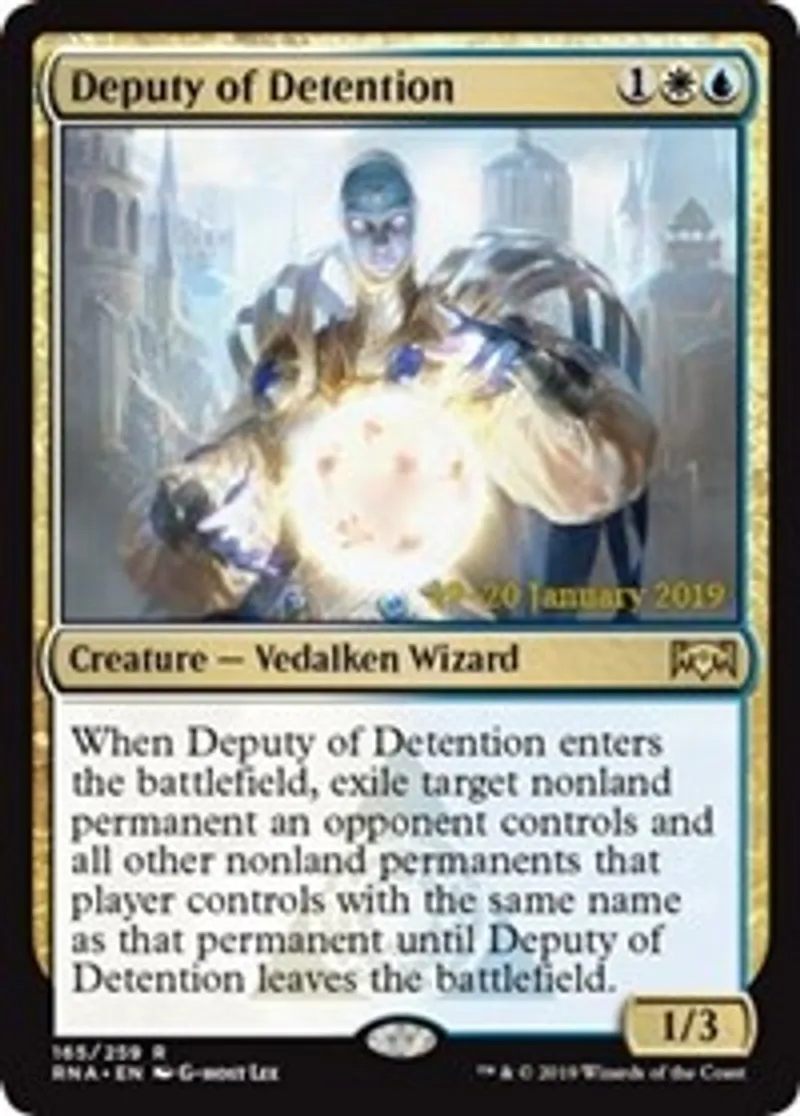 | Oracle Text | When Deputy of Detention enters the battlefield, exile target nonland permanent an opponent controls and all other nonland permanents that player controls with the same name as that permanent until Deputy of Detention leaves the battlefield. | ||