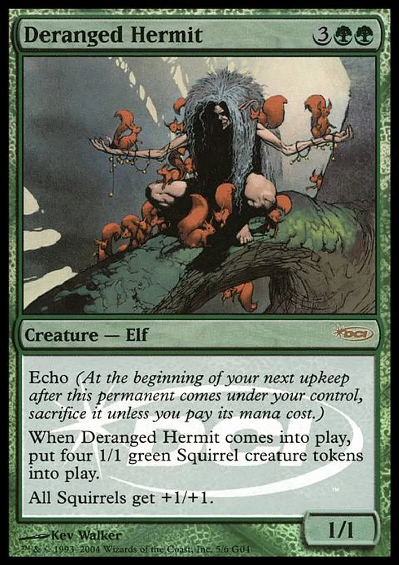 When Deranged Hermit enters the battlefield, put four 1/1 green Squirrel creature tokens onto the battlefield.