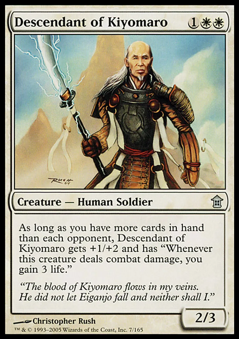 | Oracle Text | As long as you have more cards in hand than each opponent, Descendant of Kiyomaro gets +1/+2 and has "Whenever this creature deals combat damage, you gain 3 life." | ||