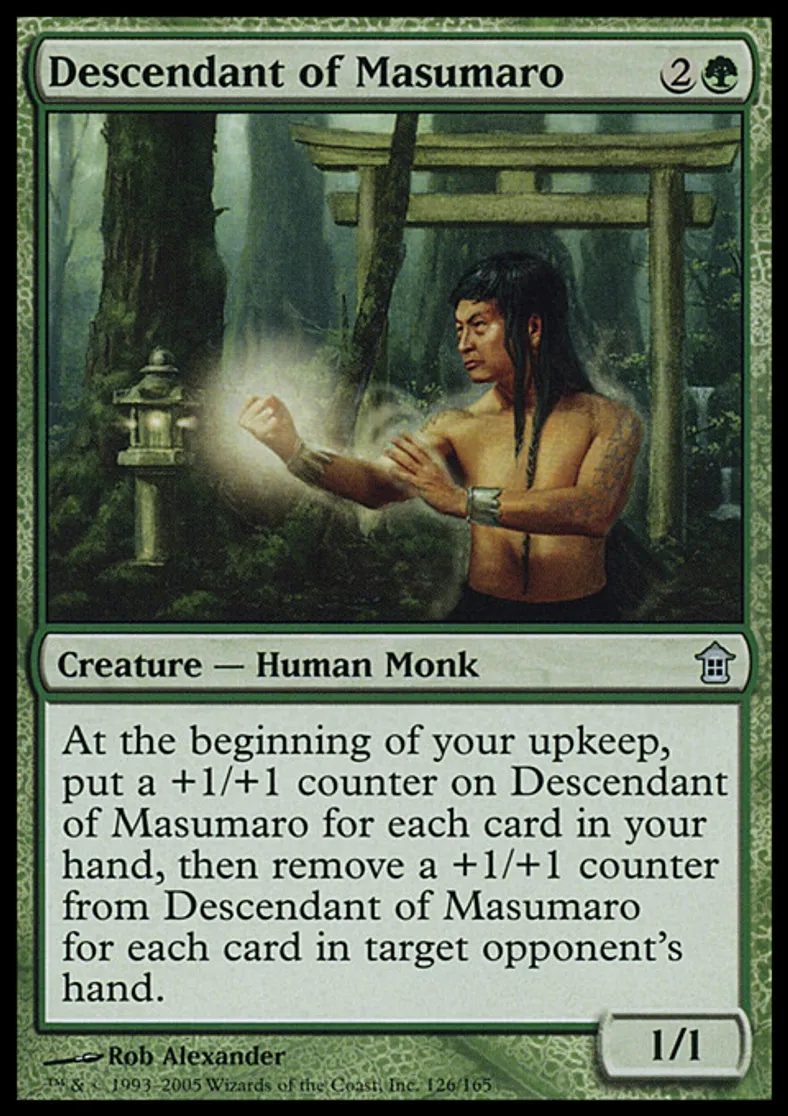 | Oracle Text | At the beginning of your upkeep, put a +1/+1 counter on Descendant of Masumaro for each card in your hand, then remove a +1/+1 counter from Descendant of Masumaro for each card in target opponent's hand. | ||
