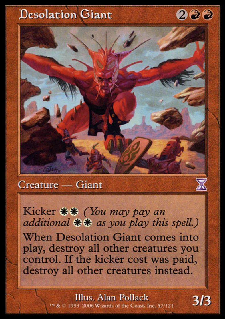 | Oracle Text | Kicker {{w}}{{w}} (You may pay an additional {{w}}{{w}} as you cast this spell.) When Desolation Giant enters the battlefield, destroy all other creatures you control. If it was kicked, destroy all other creatures instead. | ||
