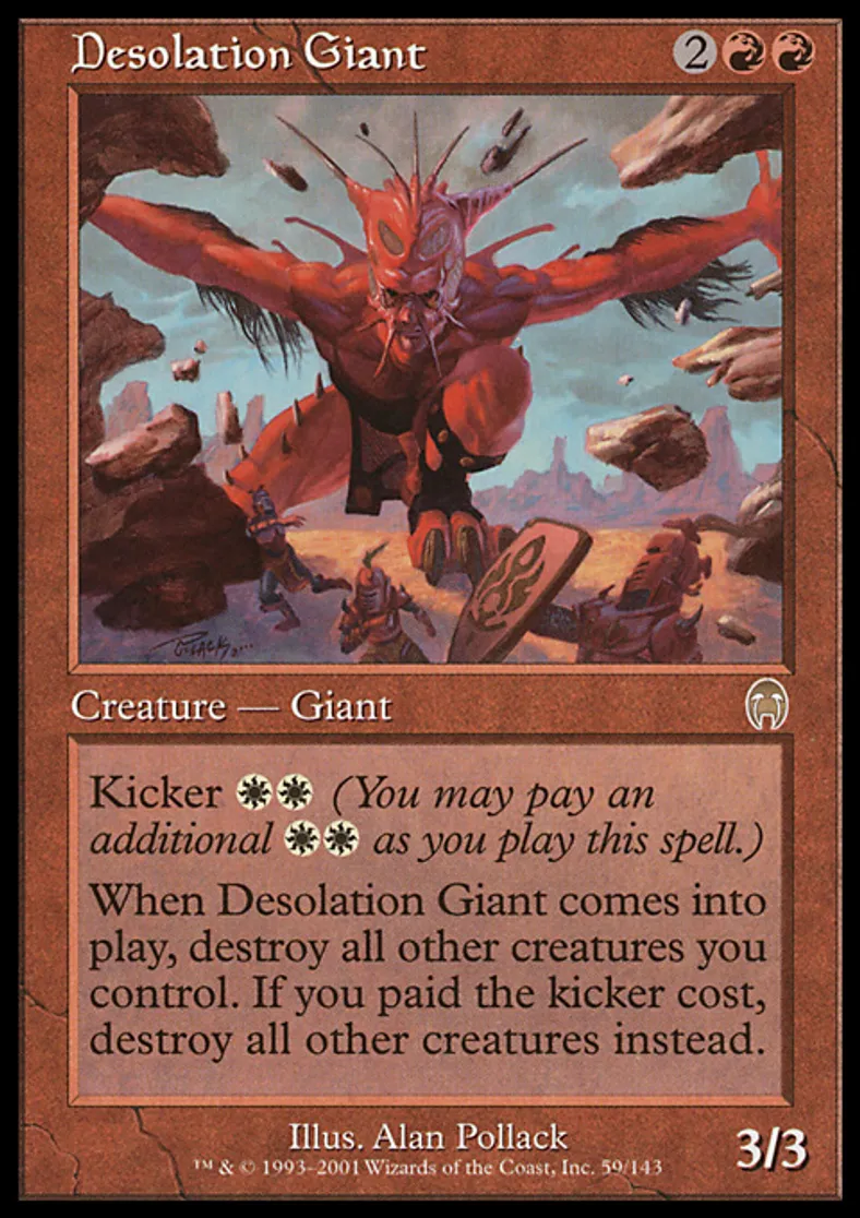 | Oracle Text | Kicker {{w}}{{w}} (You may pay an additional {{w}}{{w}} as you cast this spell.) When Desolation Giant enters the battlefield, destroy all other creatures you control. If it was kicked, destroy all other creatures instead. | ||