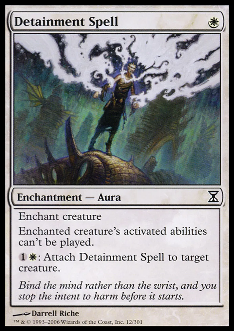 | Oracle Text | Enchant creature Enchanted creature's activated abilities can't be activated. {{1}}{{w}}: Attach Detainment Spell to target creature. | ||