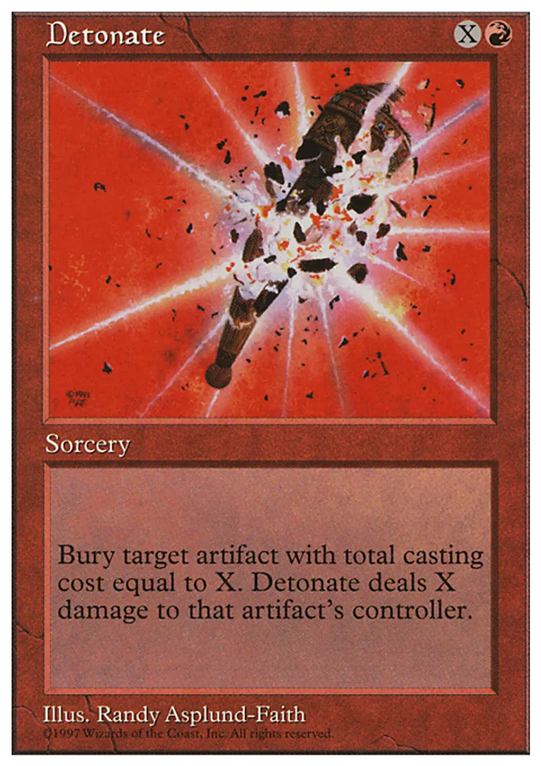 | Oracle Text | Destroy target artifact with converted mana cost X. It can't be regenerated. Detonate deals X damage to that artifact's controller. | ||