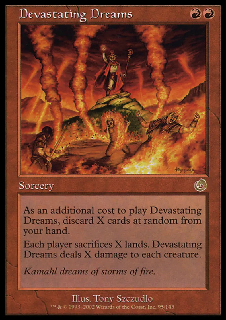 | Oracle Text | As an additional cost to cast Devastating Dreams, discard X cards at random. Each player sacrifices X lands. Devastating Dreams deals X damage to each creature. | ||