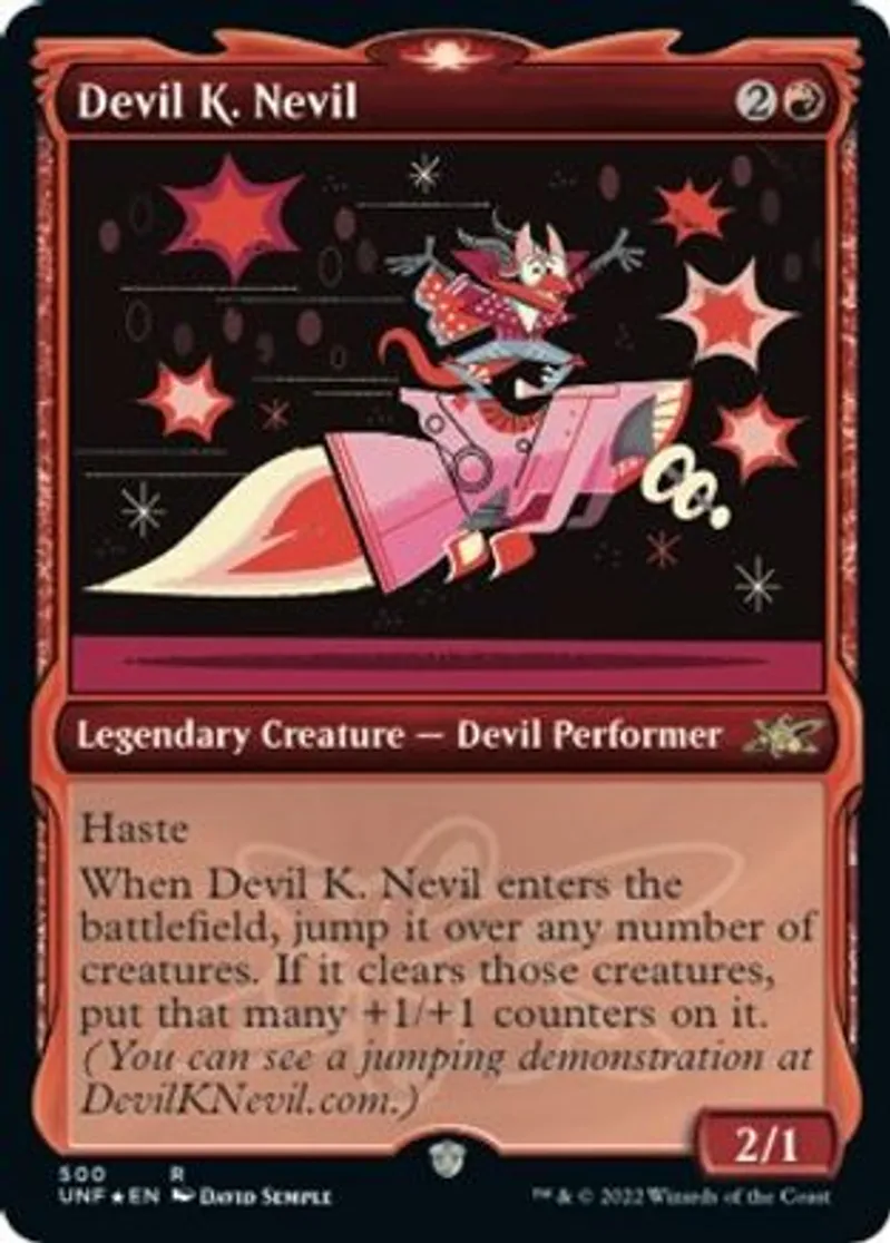 When Devil K. Nevil enters the battlefield, jump it over any number of creatures. If it clears those creatures, put that many +1/+1 counters on it. (You can see a jumping demonstration at DevilKNevil.com.) | ||