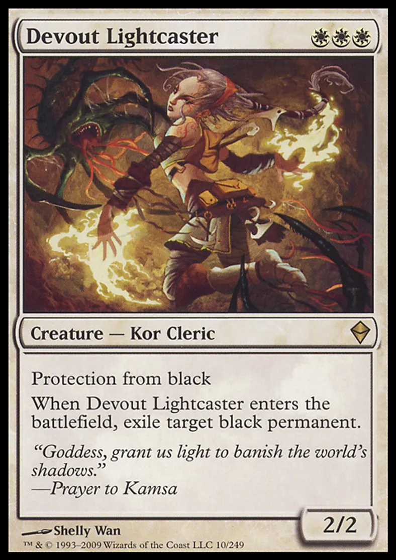 | Oracle Text | Protection from black When Devout Lightcaster enters the battlefield, exile target black permanent. | ||