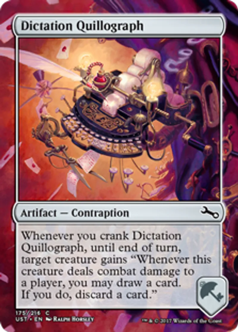 | Oracle Text | Whenever you crank Dictation Quillograph, until end of turn, target creature gains "Whenever this creature deals combat damage to a player, you may draw a card. If you do, discard a card." | ||
