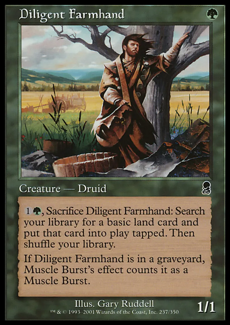 | Oracle Text | {{1}}{{g}}, Sacrifice Diligent Farmhand: Search your library for a basic land card and put that card onto the battlefield tapped. Then shuffle your library. If Diligent Farmhand is in a graveyard, effects from spells named Muscle Burst count it as a card named Muscle Burst. | ||