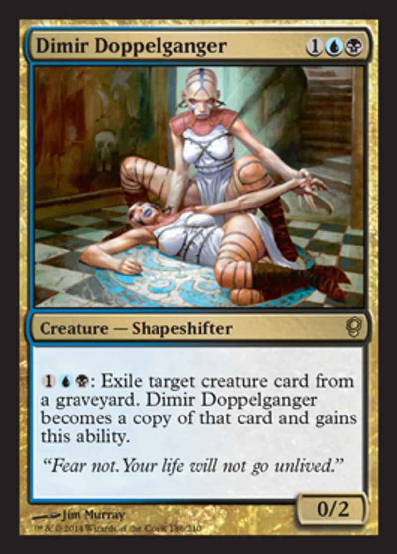 | Oracle Text | {{1}}{{u}}{{b}}: Exile target creature card from a graveyard. Dimir Doppelganger becomes a copy of that card and gains this ability. | ||