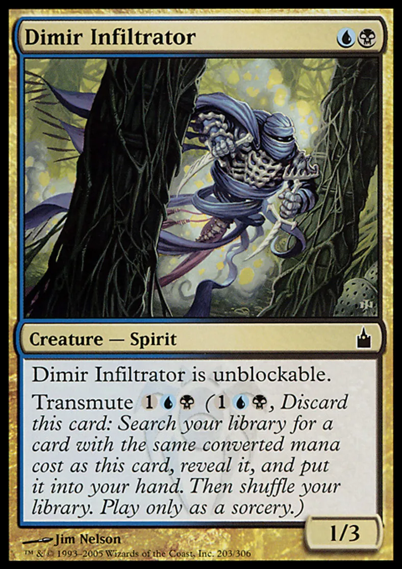 | Oracle Text | Dimir Infiltrator is unblockable. Transmute {{1}}{{u}}{{b}} ({{1}}{{u}}{{b}}, Discard this card: Search your library for a card with the same converted mana cost as this card, reveal it, and put it into your hand. Then shuffle your library. Transmute only as a sorcery.) | ||