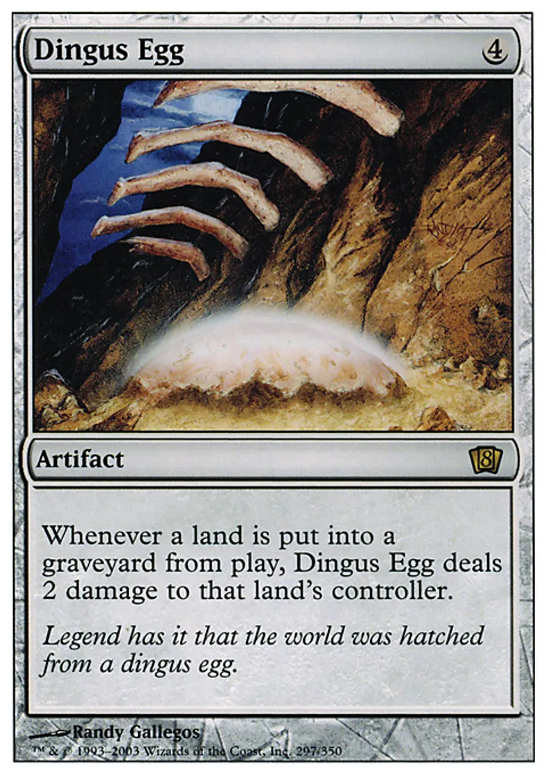 | Oracle Text | Whenever a land is put into a graveyard from the battlefield, Dingus Egg deals 2 damage to that land's controller. | ||