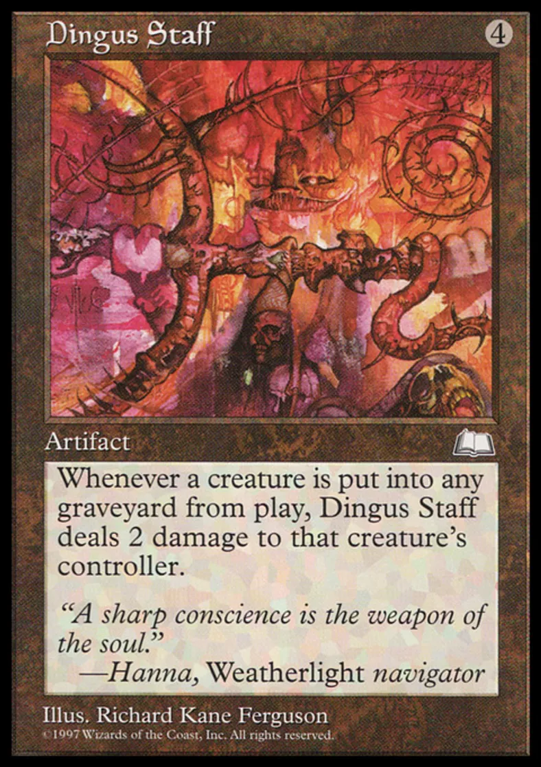 | Oracle Text | Whenever a creature dies, Dingus Staff deals 2 damage to that creature's controller. | ||