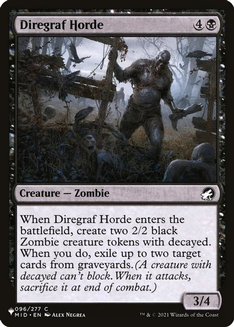 | Oracle Text | when diregraf horde enters the battlefield, create two 2/2 black zombie creature tokens with decayed. when you do, exile up to two target cards from graveyards. (a creature with decayed can't block. when it attacks, sacrifice it at end of combat.) | ||