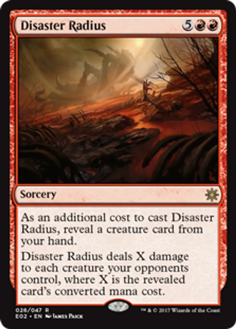 | Oracle Text | As an additional cost to cast Disaster Radius, reveal a creature card from your hand. Disaster Radius deals X damage to each creature your opponents control, where X is the revealed card's converted mana cost. | ||