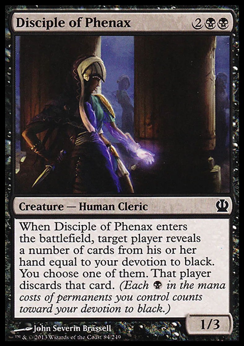 | Oracle Text | When Disciple of Phenax enters the battlefield, target player reveals a number of cards from his or her hand equal to your devotion to black. You choose one of them. That player discards that card. (Each {{b}} in the mana costs of permanents you control counts toward your devotion to black.) | ||
