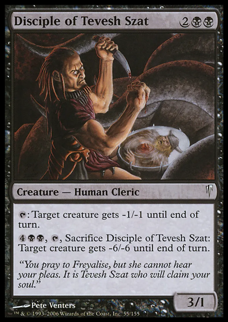 | Oracle Text | {{t}}: Target creature gets -1/-1 until end of turn. {{4}}{{b}}{{b}}, {{t}}, Sacrifice Disciple of Tevesh Szat: Target creature gets -6/-6 until end of turn. | ||