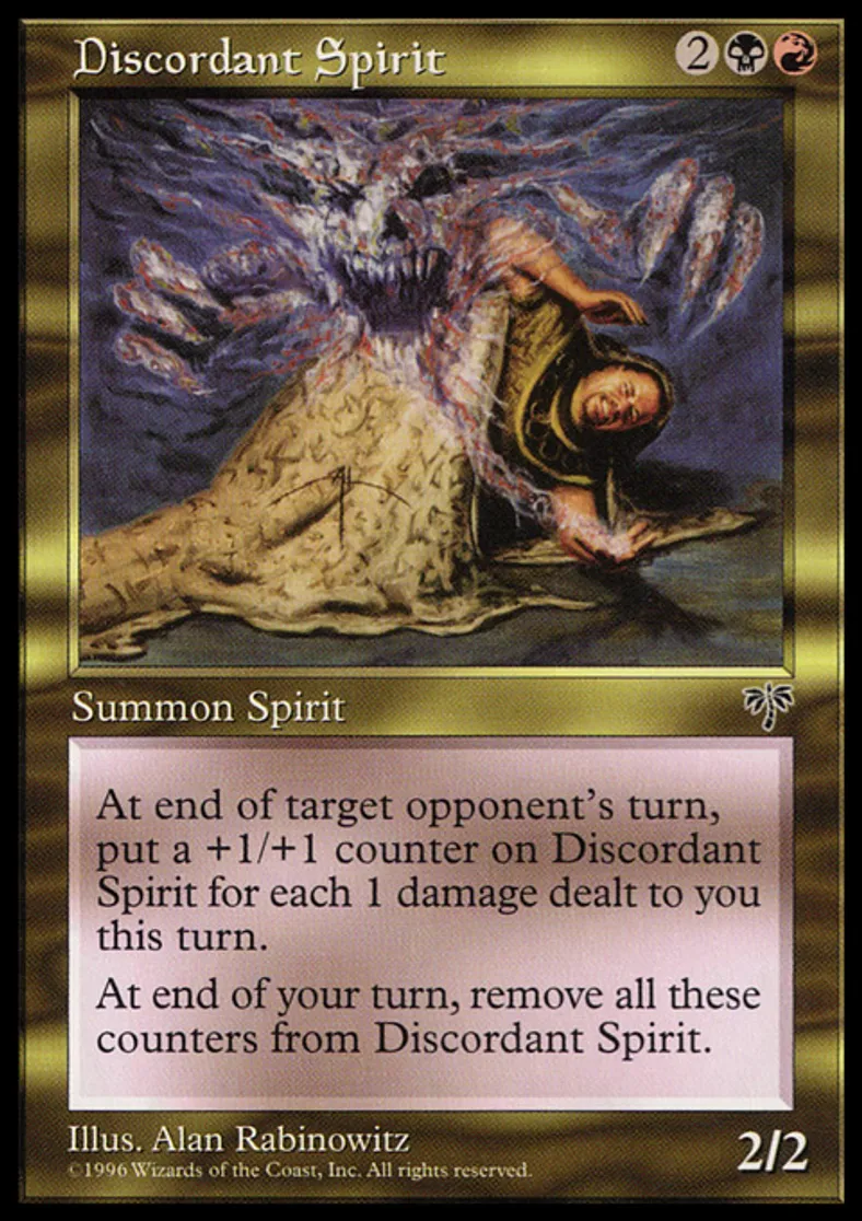 | Oracle Text | At the beginning of each end step, if it's an opponent's turn, put a +1/+1 counter on Discordant Spirit for each 1 damage dealt to you this turn. At the beginning of your end step, remove all +1/+1 counters from Discordant Spirit. | ||