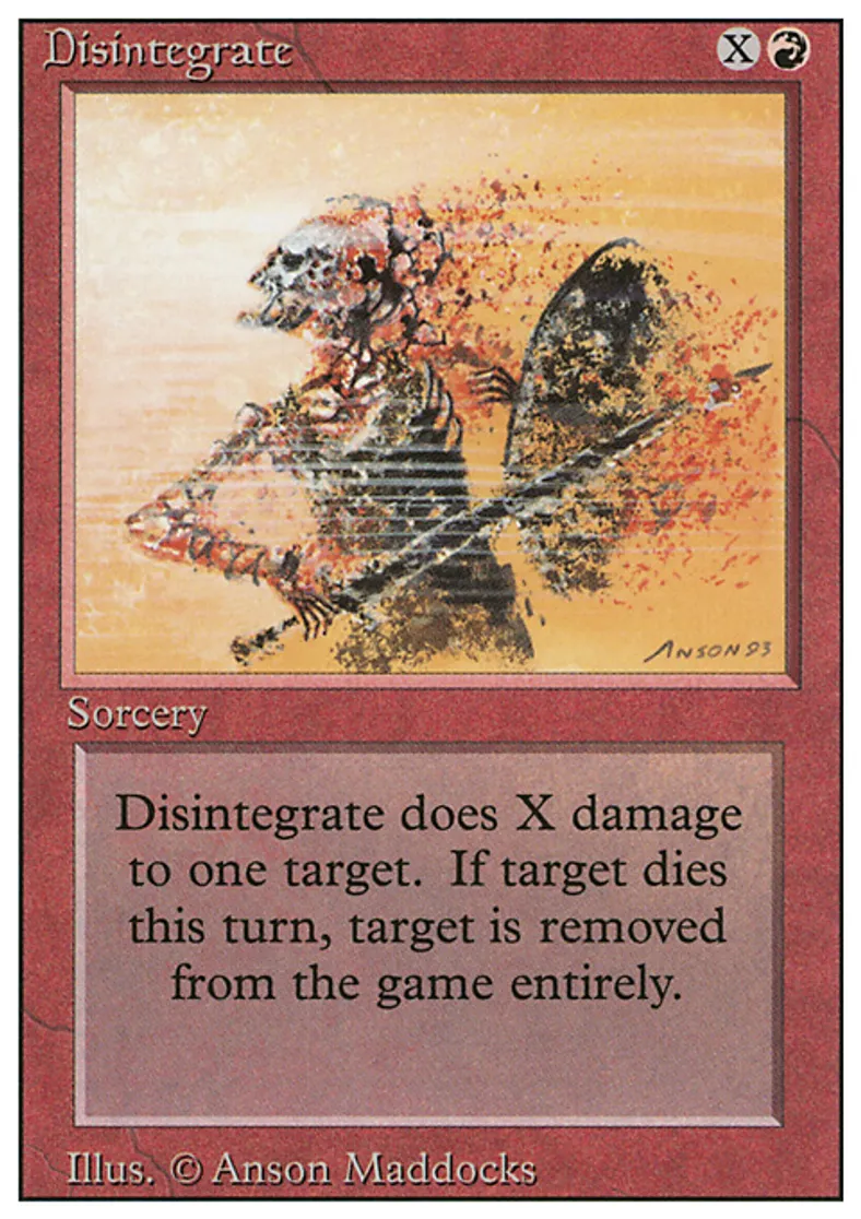 | Oracle Text | Disintegrate deals X damage to target creature or player. That creature can't be regenerated this turn. If the creature would die this turn, exile it instead. | ||