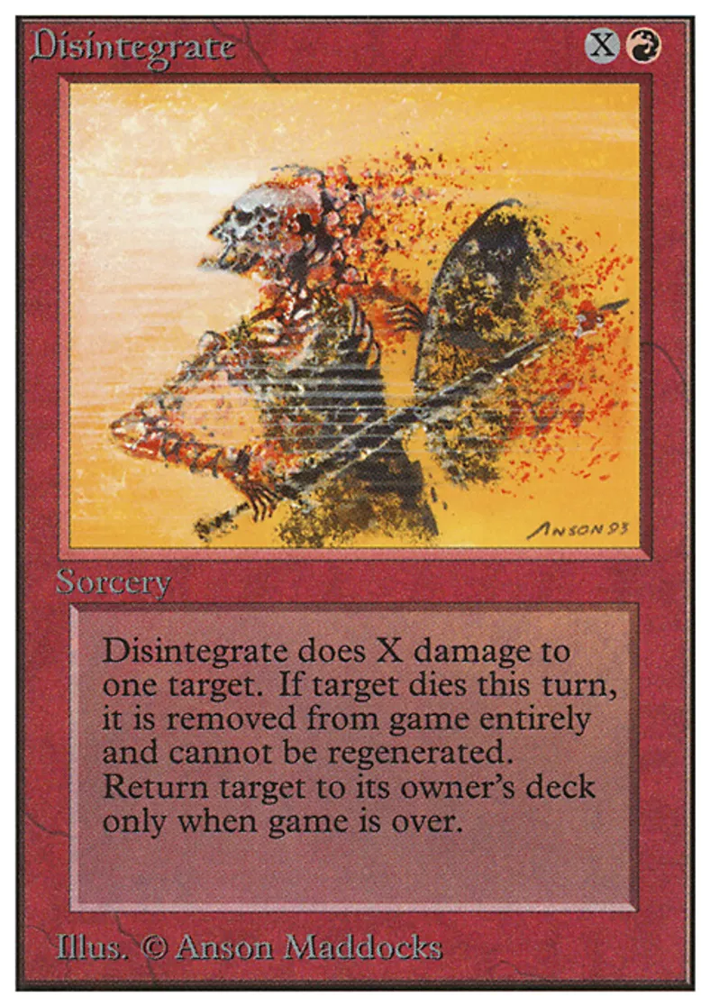 | Oracle Text | Disintegrate deals X damage to target creature or player. That creature can't be regenerated this turn. If the creature would die this turn, exile it instead. | ||