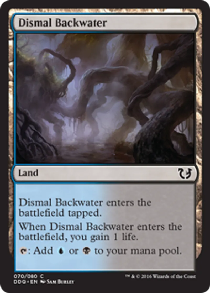 | Oracle Text | Dismal Backwater enters the battlefield tapped. When Dismal Backwater enters the battlefield, you gain 1 life. {{t}}: Add {{u}} or {{b}} to your mana pool. | ||
