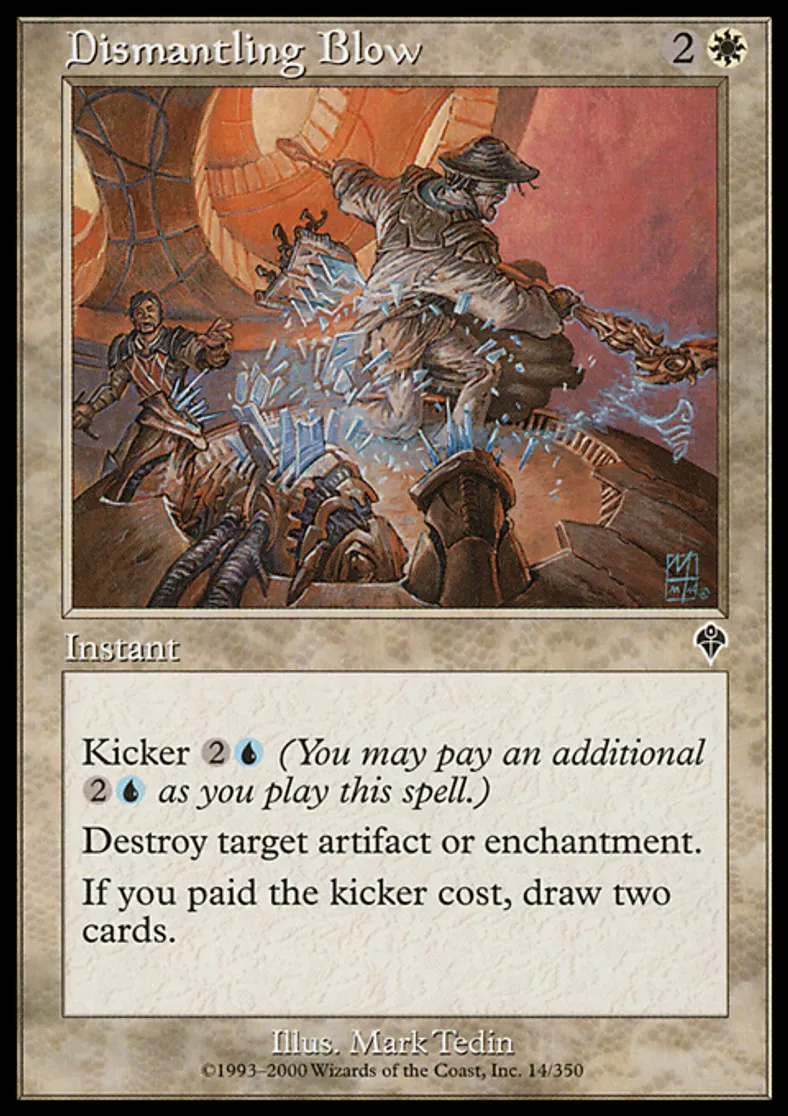 | Oracle Text | Kicker {{2}}{{u}} (You may pay an additional {{2}}{{u}} as you cast this spell.) Destroy target artifact or enchantment. If Dismantling Blow was kicked, draw two cards. | ||