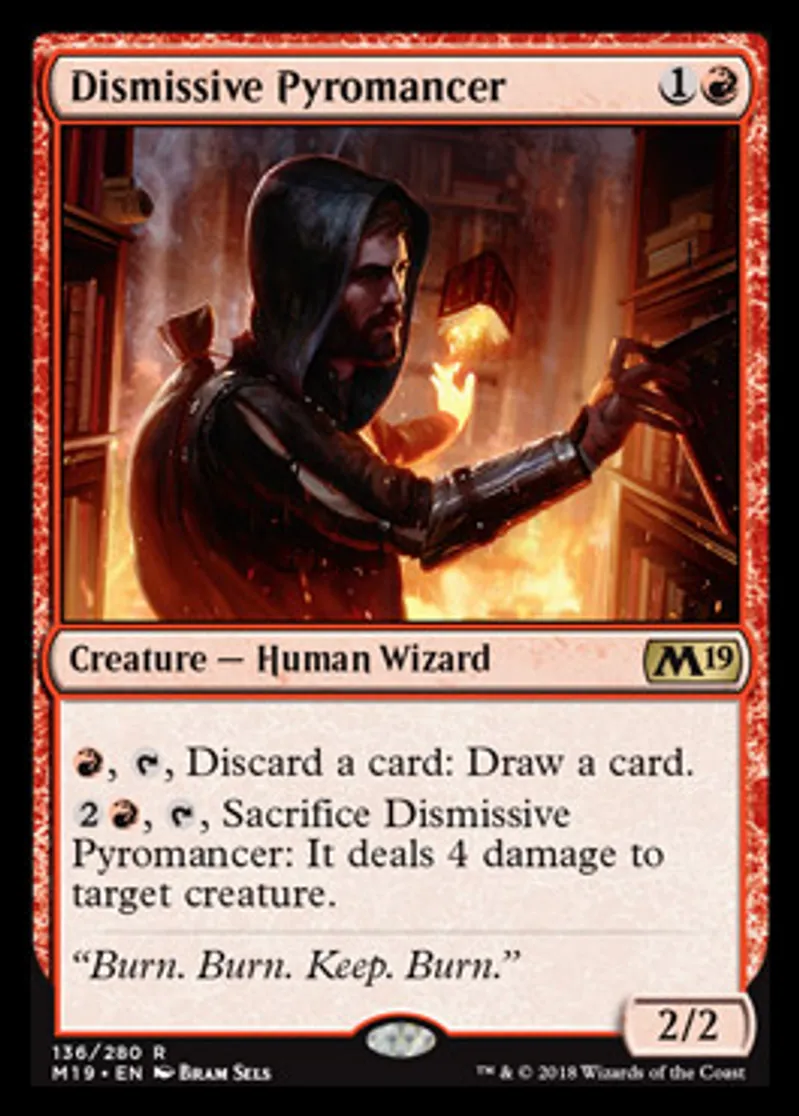 | Oracle Text | {{r}}, {{t}}, Discard a card: Draw a card. {{2}}{{r}}, {{t}}, Sacrifice Dismissive Pyromancer: It deals 4 damage to target creature. | ||