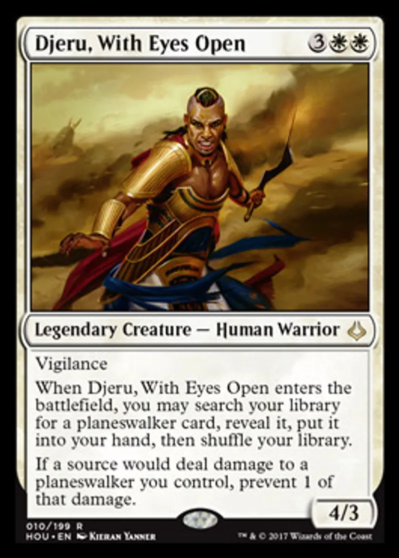 | Oracle Text | Vigilance When Djeru, With Eyes Open enters the battlefield, you may search your library for a planeswalker card, reveal it, put it into your hand, then shuffle your library. If a source would deal damage to a planeswalker you control, prevent 1 of that damage. | ||