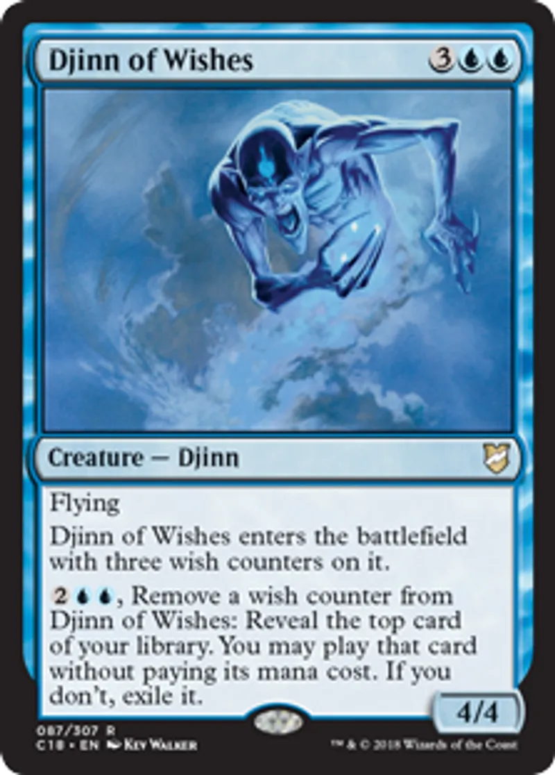 | Oracle Text | Flying Djinn of Wishes enters the battlefield with three wish counters on it. {{2}}{{u}}{{u}}, Remove a wish counter from Djinn of Wishes: Reveal the top card of your library. You may play that card without paying its mana cost. If you don't, exile it. | ||