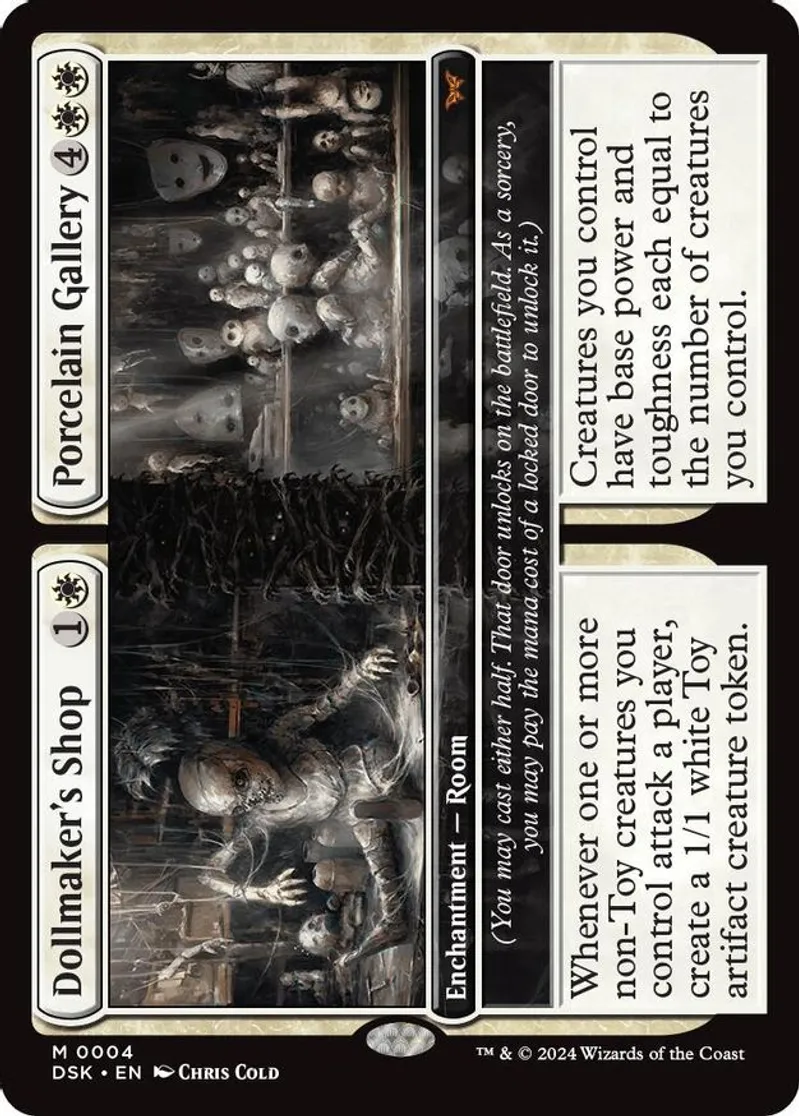 Magic: the Gathering (mtg) Mythic Rare enchantment — room Dollmaker's Shop // Porcelain Gallery from Duskmourn: House of Horror (DSK) last updated 2025-12-21 15:14:36
