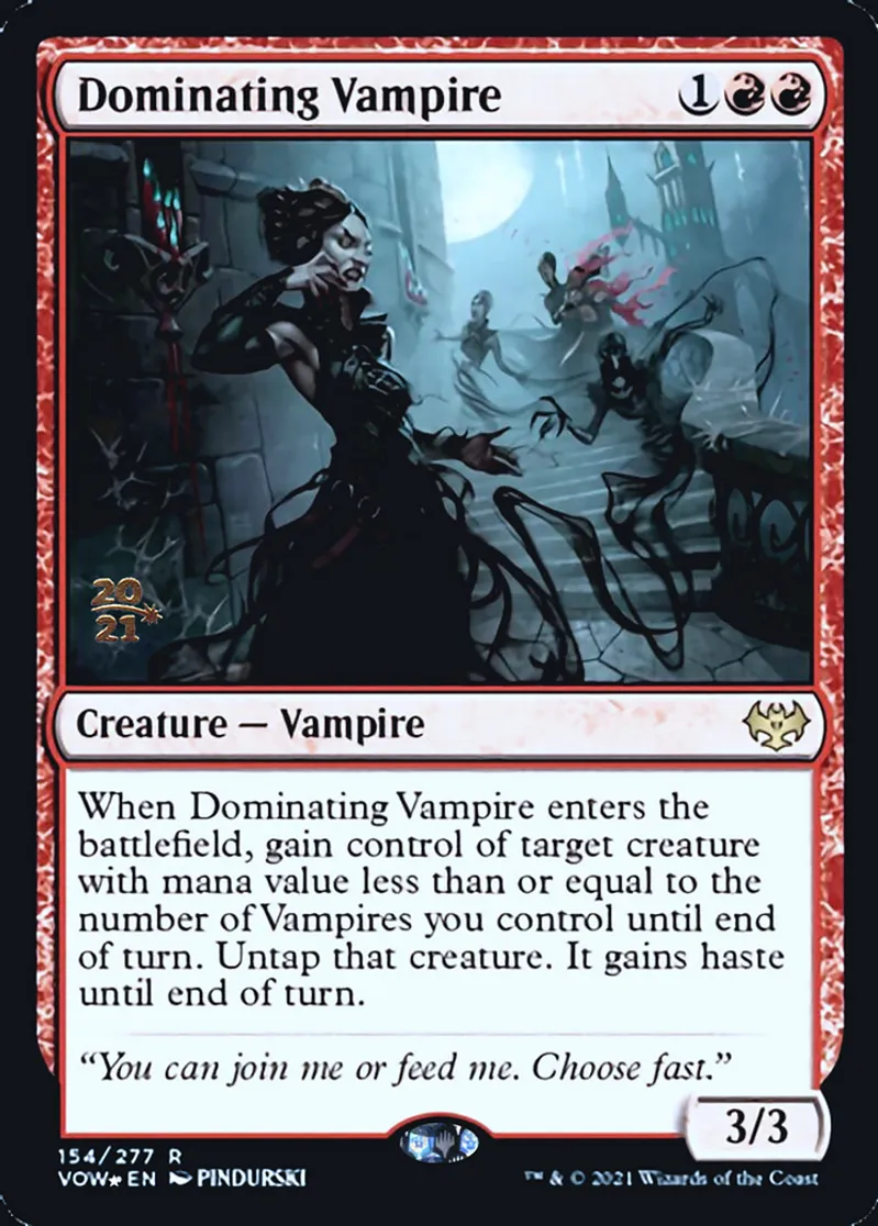 | Oracle Text | When Dominating Vampire enters the battlefield, gain control of target creature with mana value less than or equal to the number of Vampires you control until end of turn. Untap that creature. It gains haste until end of turn. | ||