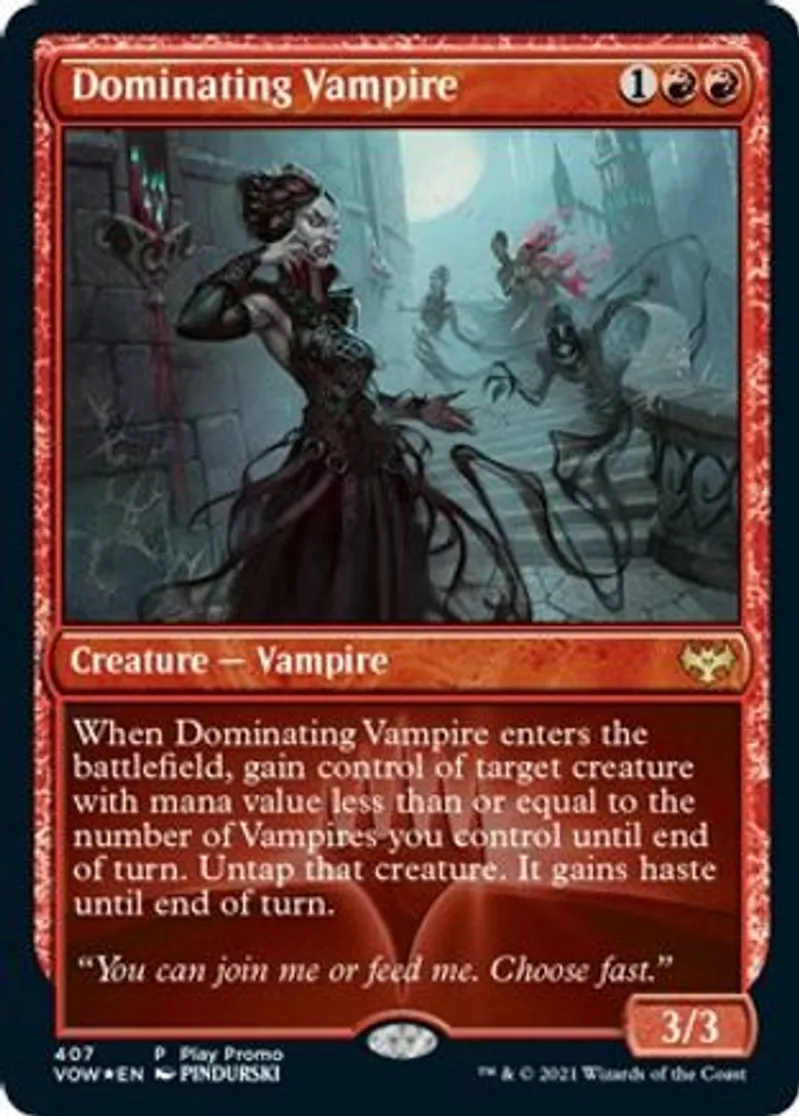 | Oracle Text | When Dominating Vampire enters the battlefield, gain control of target creature with mana value less than or equal to the number of Vampires you control until end of turn. Untap that creature. It gains haste until end of turn. | ||