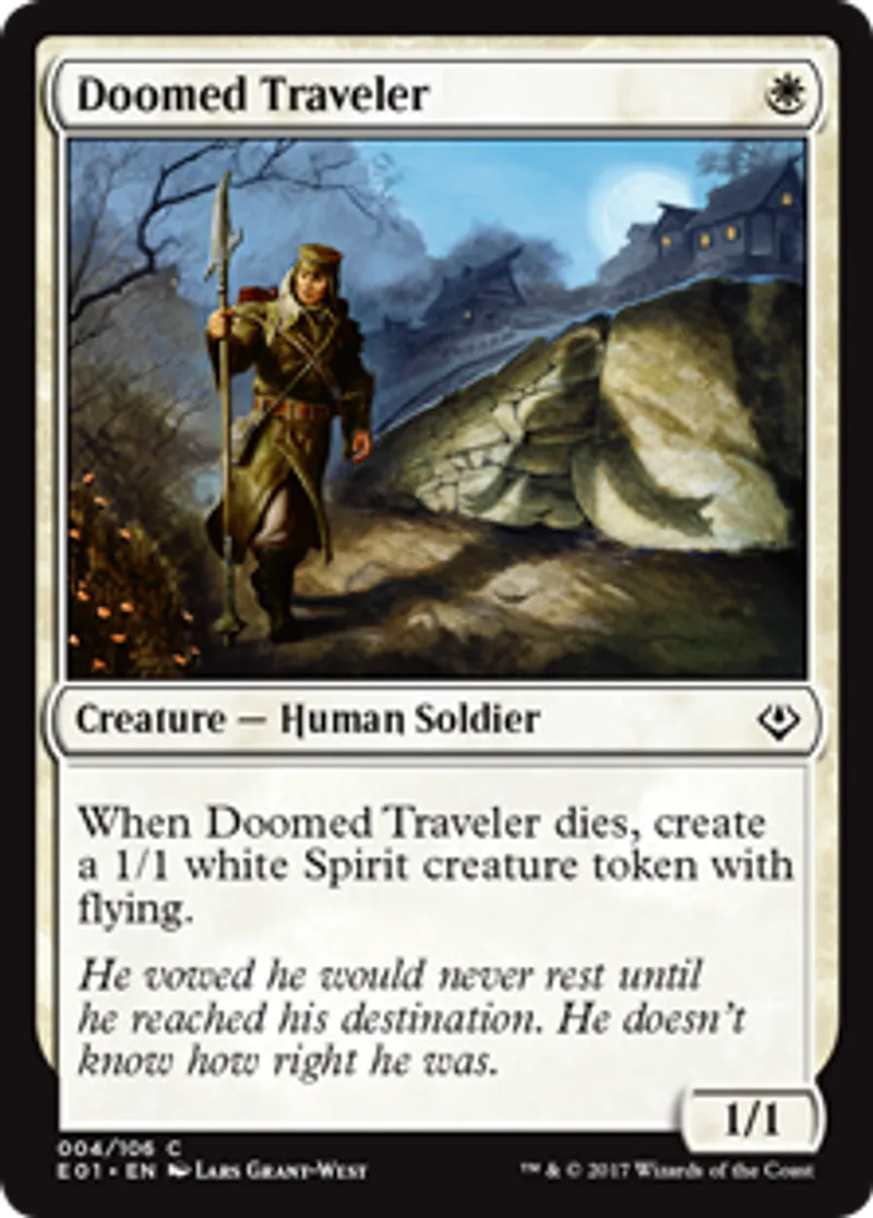| Oracle Text | When Doomed Traveler dies, create a 1/1 white Spirit creature token with flying. | ||