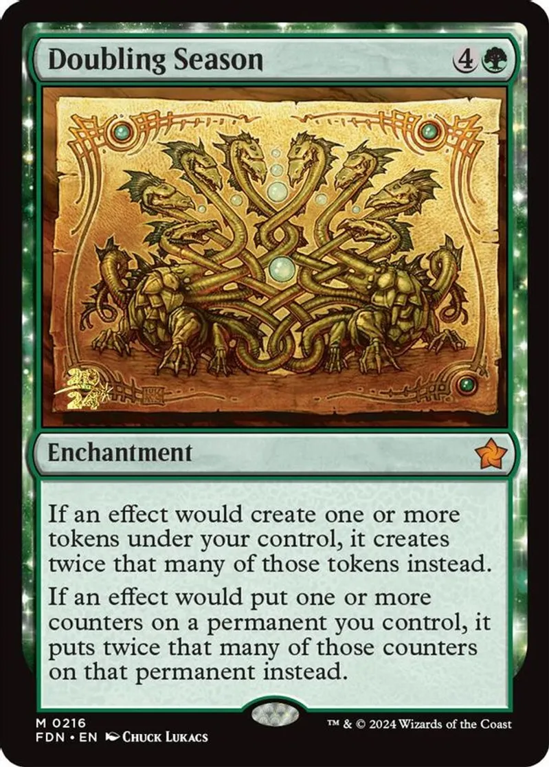 | Oracle Text | if an effect would create one or more tokens under your control, it creates twice that many of those tokens instead. if an effect would put one or more counters on a permanent you control, it puts twice that many of those counters on that permanent instead. | ||