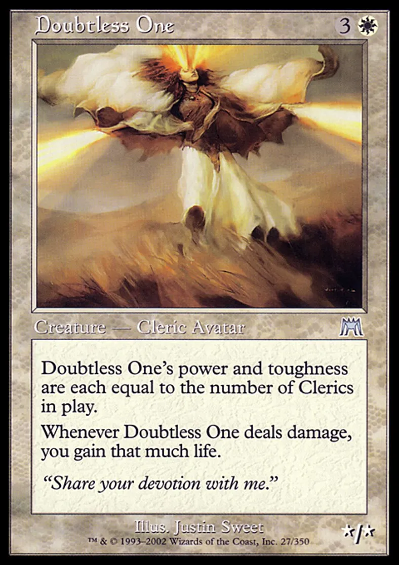 | Oracle Text | Doubtless One's power and toughness are each equal to the number of Clerics on the battlefield. Whenever Doubtless One deals damage, you gain that much life. | ||