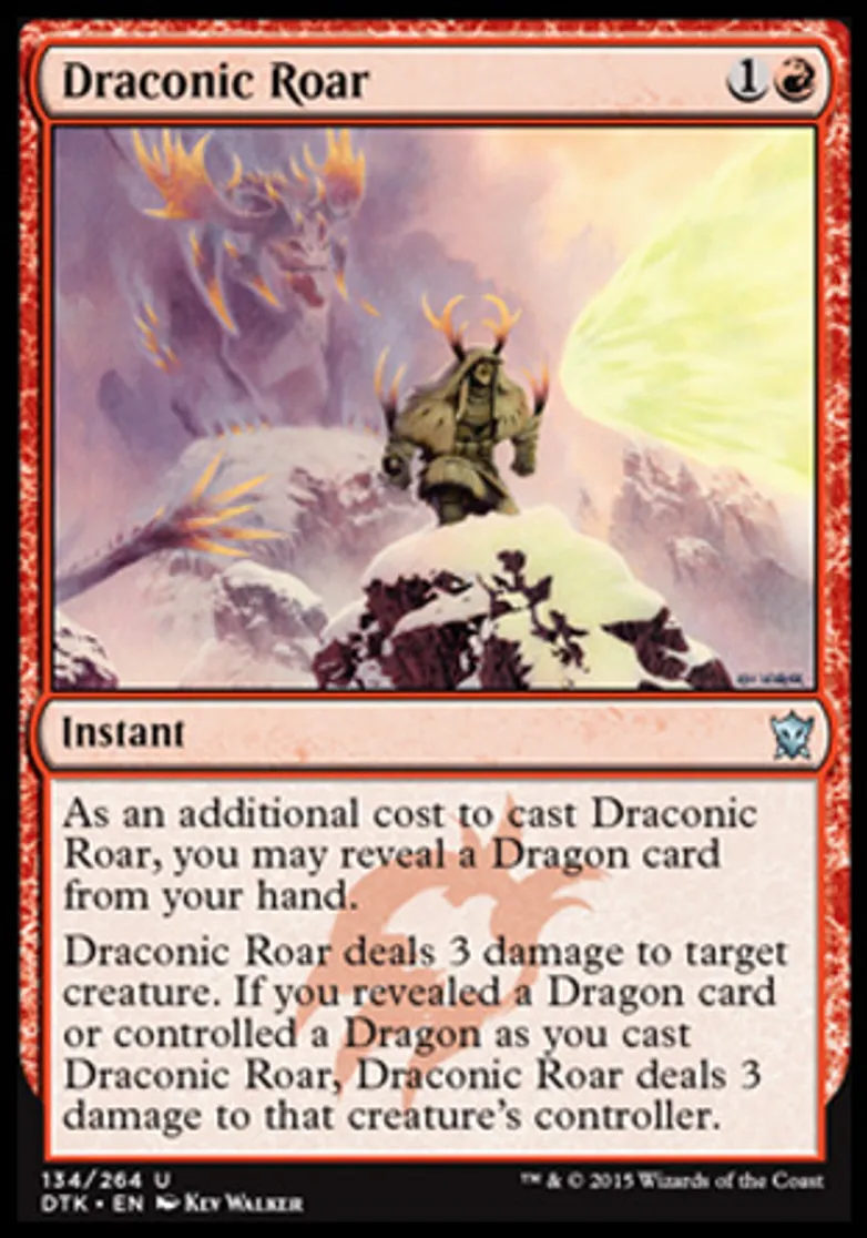 | Oracle Text | As an additional cost to cast Draconic Roar, you may reveal a Dragon card from your hand. Draconic Roar deals 3 damage to target creature. If you revealed a Dragon card or controlled a Dragon as you cast Draconic Roar, Draconic Roar deals 3 damage to that creature's controller. | ||