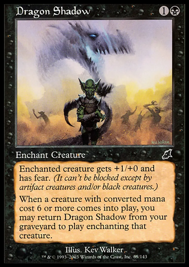 | Oracle Text | Enchant creature Enchanted creature gets +1/+0 and has fear. (It can't be blocked except by artifact creatures and/or black creatures.) When a creature with converted mana cost 6 or greater enters the battlefield, you may return Dragon Shadow from your graveyard to the battlefield attached to that creature. | ||