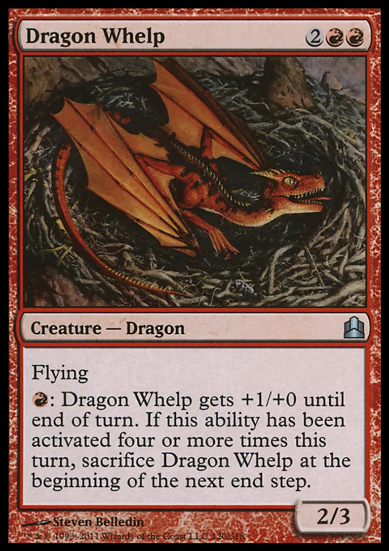 | Oracle Text | Flying {{r}}: Dragon Whelp gets +1/+0 until end of turn. If this ability has been activated four or more times this turn, sacrifice Dragon Whelp at the beginning of the next end step. | ||