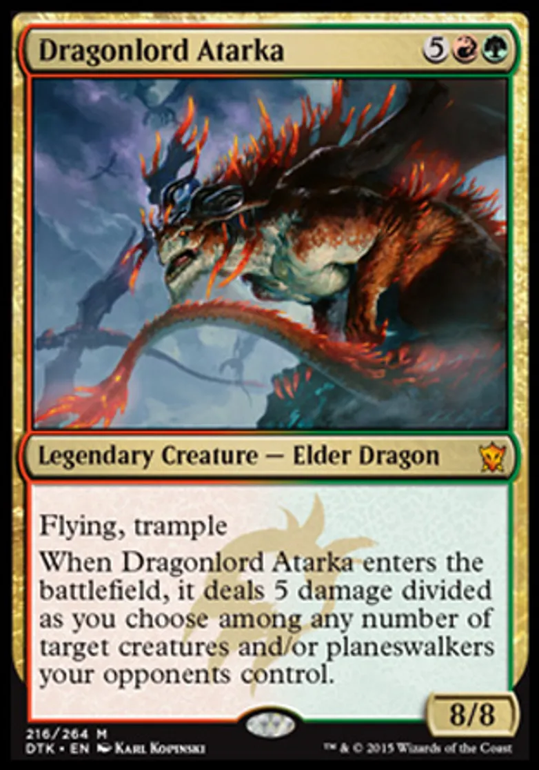 | Oracle Text | Flying, trample When Dragonlord Atarka enters the battlefield, it deals 5 damage divided as you choose among any number of target creatures and/or planeswalkers your opponents control. | ||