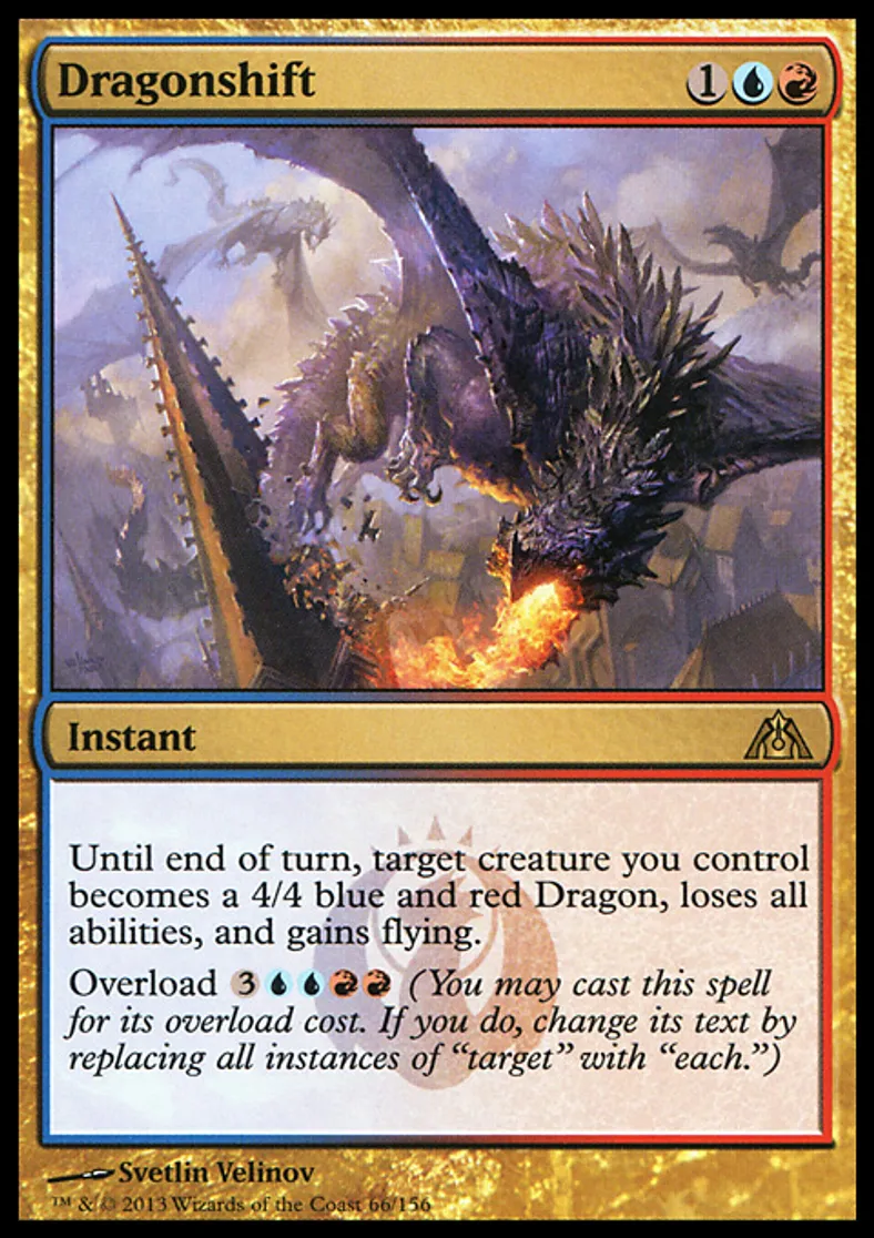 | Oracle Text | Until end of turn, target creature you control becomes a 4/4 blue and red Dragon, loses all abilities, and gains flying. Overload {{3}}{{u}}{{u}}{{r}}{{r}} (You may cast this spell for its overload cost. If you do, change its text by replacing all instances of "target" with "each.") | ||