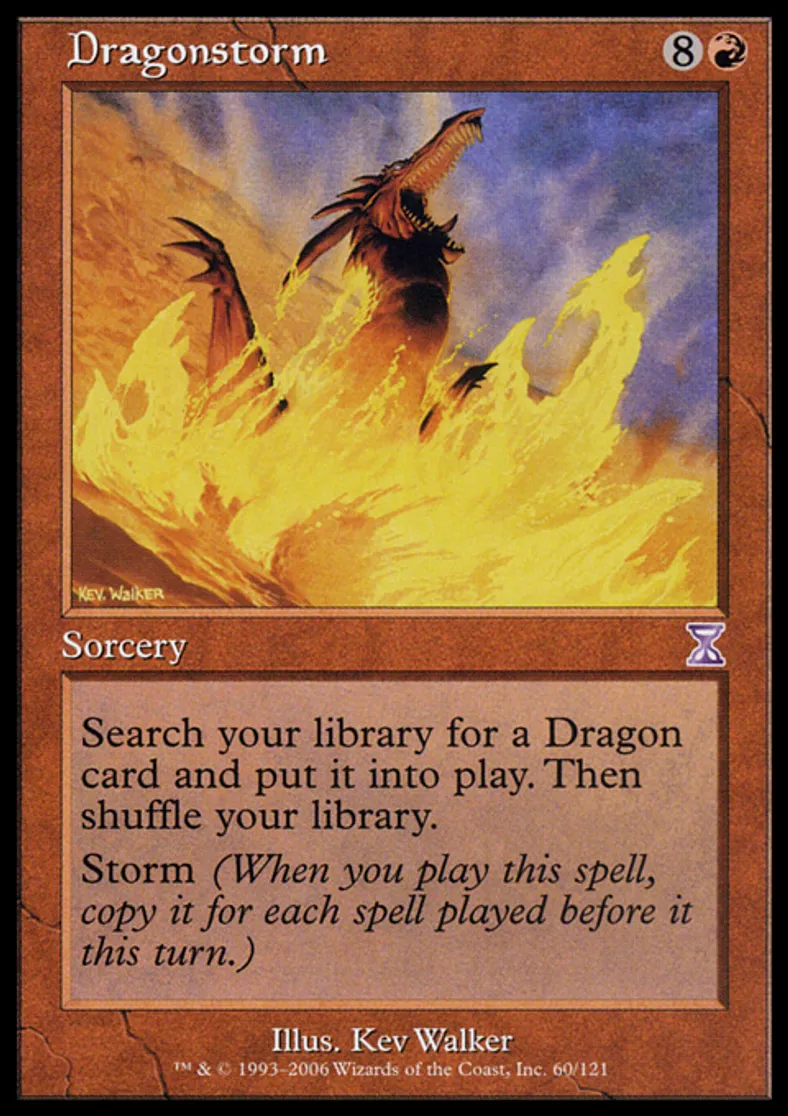 | Oracle Text | Search your library for a Dragon permanent card and put it onto the battlefield. Then shuffle your library. Storm (When you cast this spell, copy it for each spell cast before it this turn.) | ||
