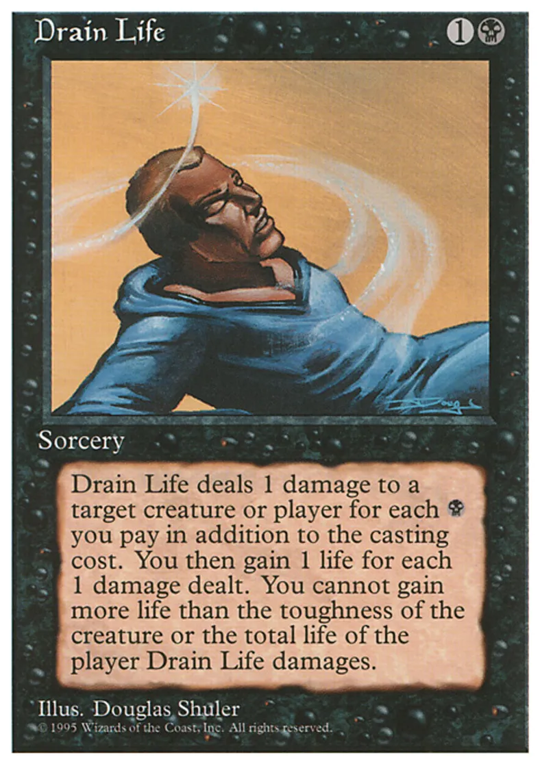 | Oracle Text | Spend only black mana on X. Drain Life deals X damage to target creature or player. You gain life equal to the damage dealt, but not more life than the player's life total before Drain Life dealt damage or the creature's toughness. | ||