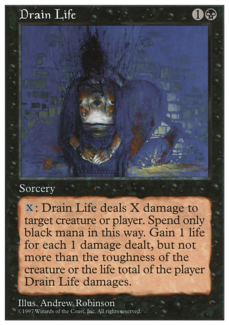 | Oracle Text | Spend only black mana on X. Drain Life deals X damage to target creature or player. You gain life equal to the damage dealt, but not more life than the player's life total before Drain Life dealt damage or the creature's toughness. | ||
