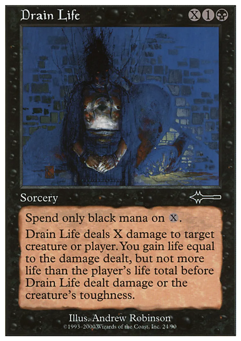 | Oracle Text | Spend only black mana on X. Drain Life deals X damage to target creature or player. You gain life equal to the damage dealt, but not more life than the player's life total before Drain Life dealt damage or the creature's toughness. | ||
