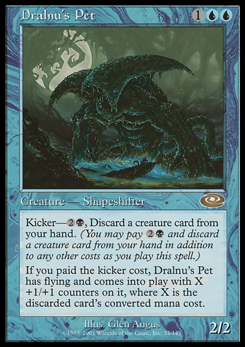 | Oracle Text | Kicker—{{2}}{{b}}, Discard a creature card. (You may pay {{2}}{{b}} and discard a creature card in addition to any other costs as you cast this spell.) If Dralnu's Pet was kicked, it enters the battlefield with flying and with X +1/+1 counters on it, where X is the discarded card's converted mana cost. | ||